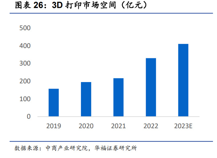 国内 3D 打印规模在 2022 年达到了 330 亿元,较 2021 年增长 52.42%。据中 商产业研究院预测,我国 3D 打印市场规模在 2023 年将达到 410 亿元,2021-2023 年年均复合增速为 37.61%。从国内市场结构来看,我国 3D 打印设备、3D 打印服 务、3D 打印材料市场份额占比分别为 49.5%、26.5%和 24.0%。