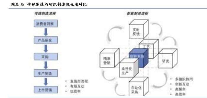 相较于传统制造,智能制造能够赋予制造业体系多组织协同与高效率特性。传统 制造业体系为单一直线型,各环节互动有限,信息反馈速度慢,导致效率低。而在智 能化下的制造业体系中,它变得更加互动且环式结构,信息实时反馈与工艺、研发之 间呈双向往来关系,这有利于根据消费者需求来定义产品特性。与此同时,自动化采 购能够降低成本与周期,而柔性化生产与营销的实时互动使得生产能够更好地响应市 场变化,从而避免了负面影响的发生。