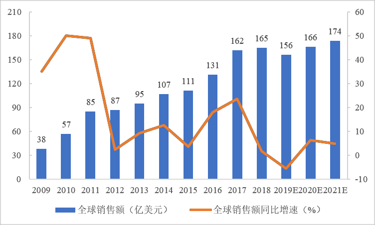 IFR 预测2019-2021年全球工业机器人销售额复合增长率为1.85%;2019年全球工业机器人销售量将同比下滑0.24%,但2020年及2021年销量同比增速将回升,分别为11.64%和10.64%。